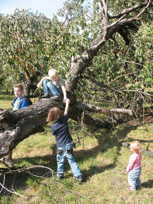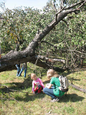 Schließlich verfolgten die Kinder die Spur der weißen Schafswolle, die an vielen Baumstämmen der Streuobstwiese hing, und fanden die Herde der Leineschafe auf der anderen Seite des Ösel.