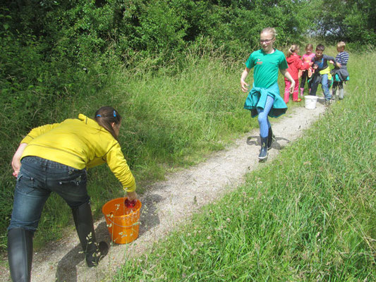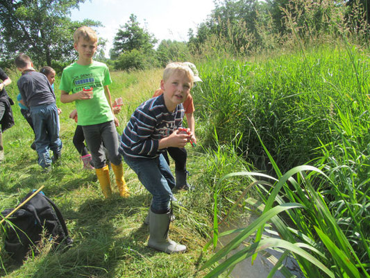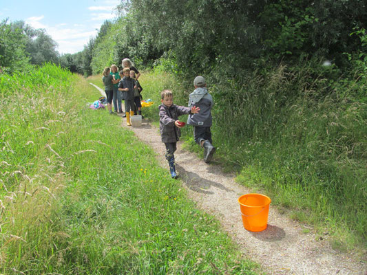 Gegenüber der alten Ziegelei Fümmelse wurden am Brückenbach zunächst Fragen zum Wasser geklärt. Wie kommt das Wasser in den Bach? Wohin fließt es? Wer braucht das Wasser und wofür? Beim "Wettlauf um das Wasser" lernten die Kinder auf spielerische Weise, dass wir Menschen als Verbraucher der Natur nicht mehr Wasser entnehmen dürfen, als die Natur uns zur Verfügung stellt.