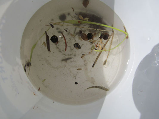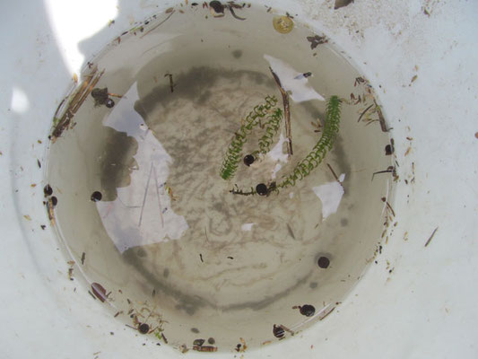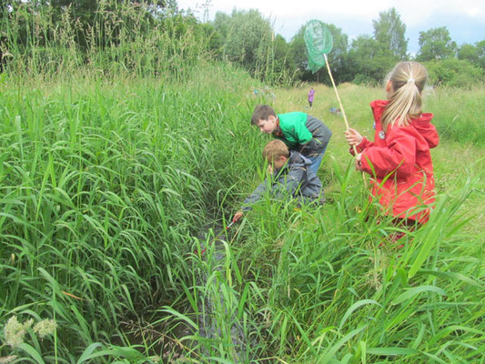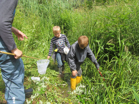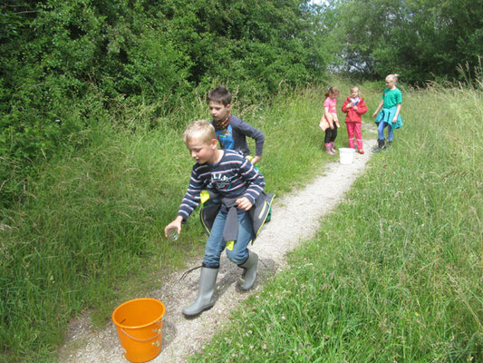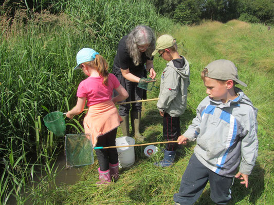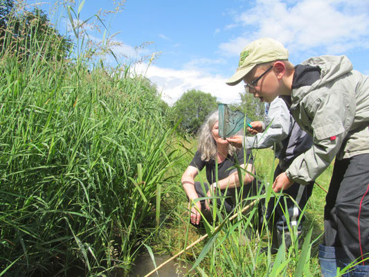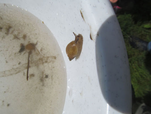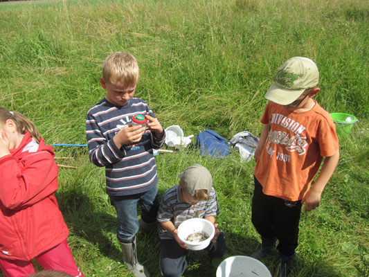 Anschließend wurde an einer gut zugänglichen Stelle im Brückenbach gekeschert. Dabei konnten zahlreiche Wassertiere gefangen und beobachtet werden: Bachflohkrebse, Eintagsfliegenlarven, Käferlarven, verschiedene Schnecken und Würmer sowie zwei kleine Fische. Schließlich wurden die Tiere wieder in ihrem Lebensraum, dem Bach, frei gelassen.