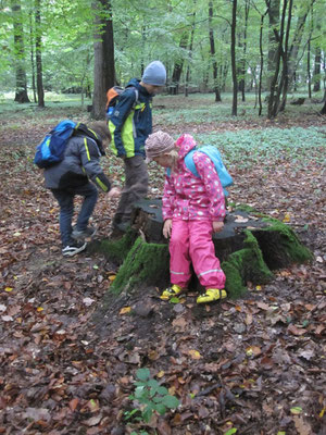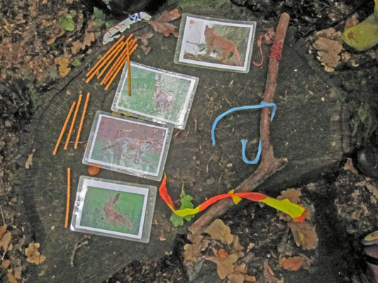 Dann konnten die Kinder wie der Luchs auf die Jagd nach Rehen, Füchsen und Hasen gehen, dargestellt mit verschieden markierten Stöcken. Wer ein Reh fand, hatte den Rest der Woche genug zu fressen. Der Hase reichte nur für einen Tag, so dass man schon am "nächsten Tag" wieder jagen musste. Und ganz ohne Jagderfolg knurrte dann schon mächtig der Magen des "Kinderluchses".
